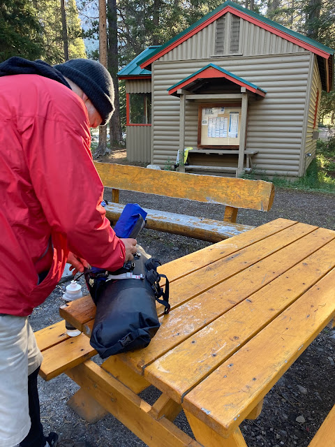 The Icefields Parkway concludes at this point. The remainder of the way to Banff was on the Bow Valley Parkway which was lovely, made safer by tons of bikers who passed us singly and in pelotons. Truth be told, I have not passed a single cyclist on this trip unless they are fixing a flat or stopped for lunch. I am a waddling tortoise compared to these hares (but we know how that story ended).